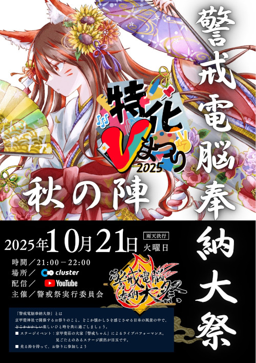 警戒電脳奉納大祭は個人勢VTuberである警戒ちゃんによるメタバースLiveです。このライブはVtuber x クリエイターによる合作ライブで様々な演出や世界観などを通し毎回世界観が構築されていきます。cluster上では会場の雰囲気やライブ感、Youtube上ではコメントによる視聴者との一体感も楽しめるイベントとなっています。